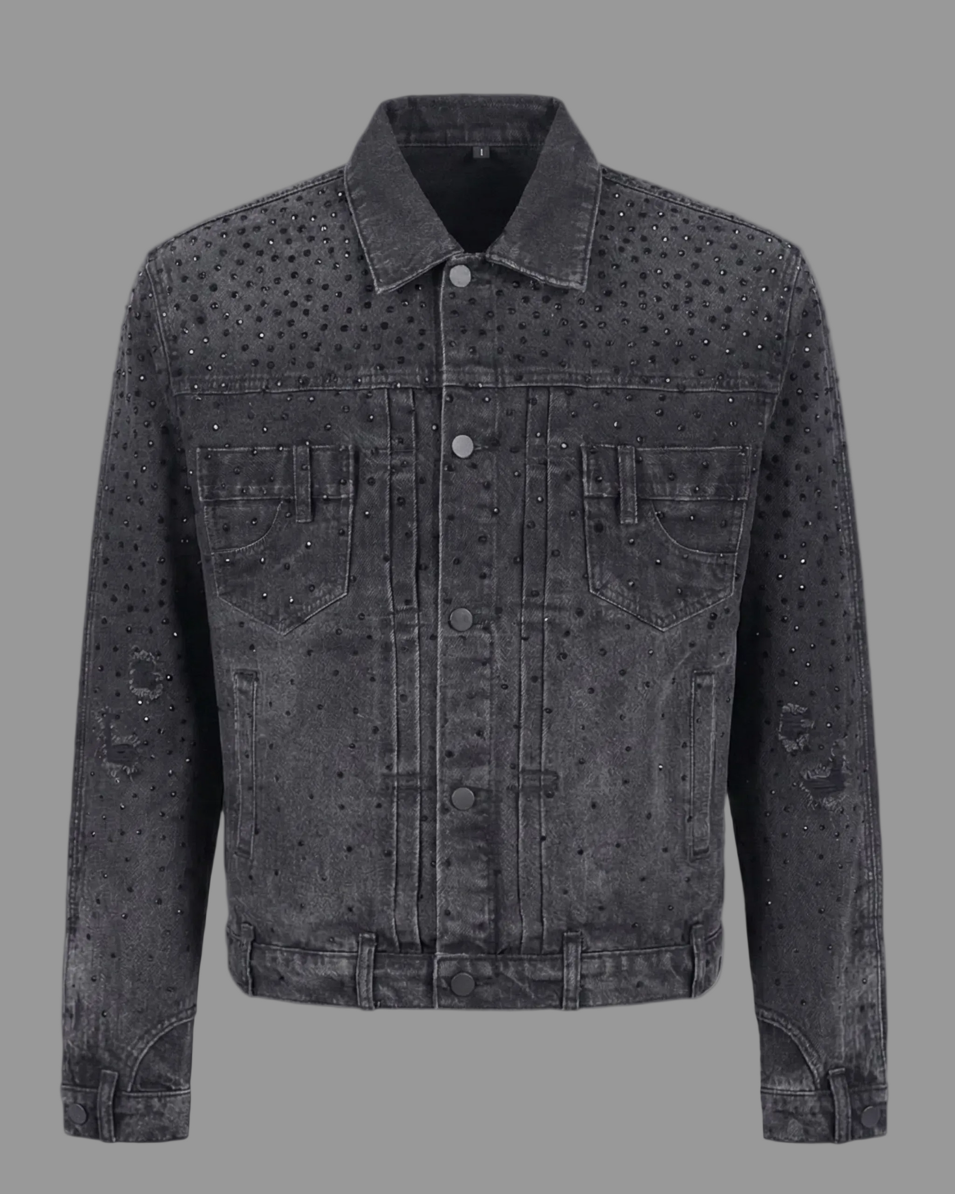 Crafted from premium black-washed denim with an icy, worn-in finish, the jacket delivers structure without stiffness. All-over micro-rhinestone embellishments are meticulously placed across the front, back, and sleeves, creating a subtle shimmer that reveals itself through movement and light rather than overt shine. The result is restrained opulence — powerful, not flashy.