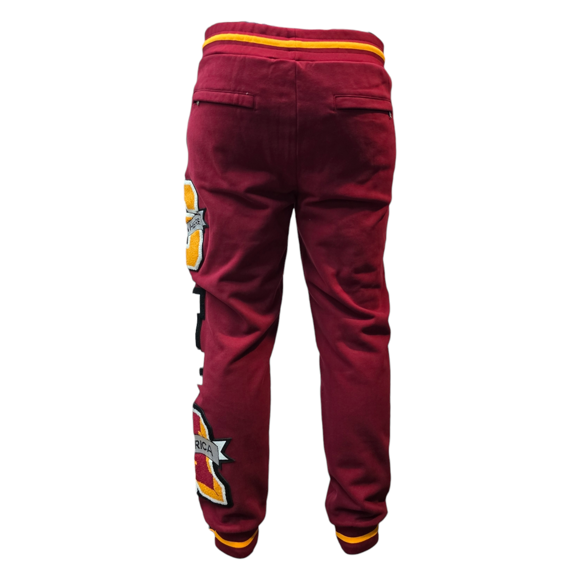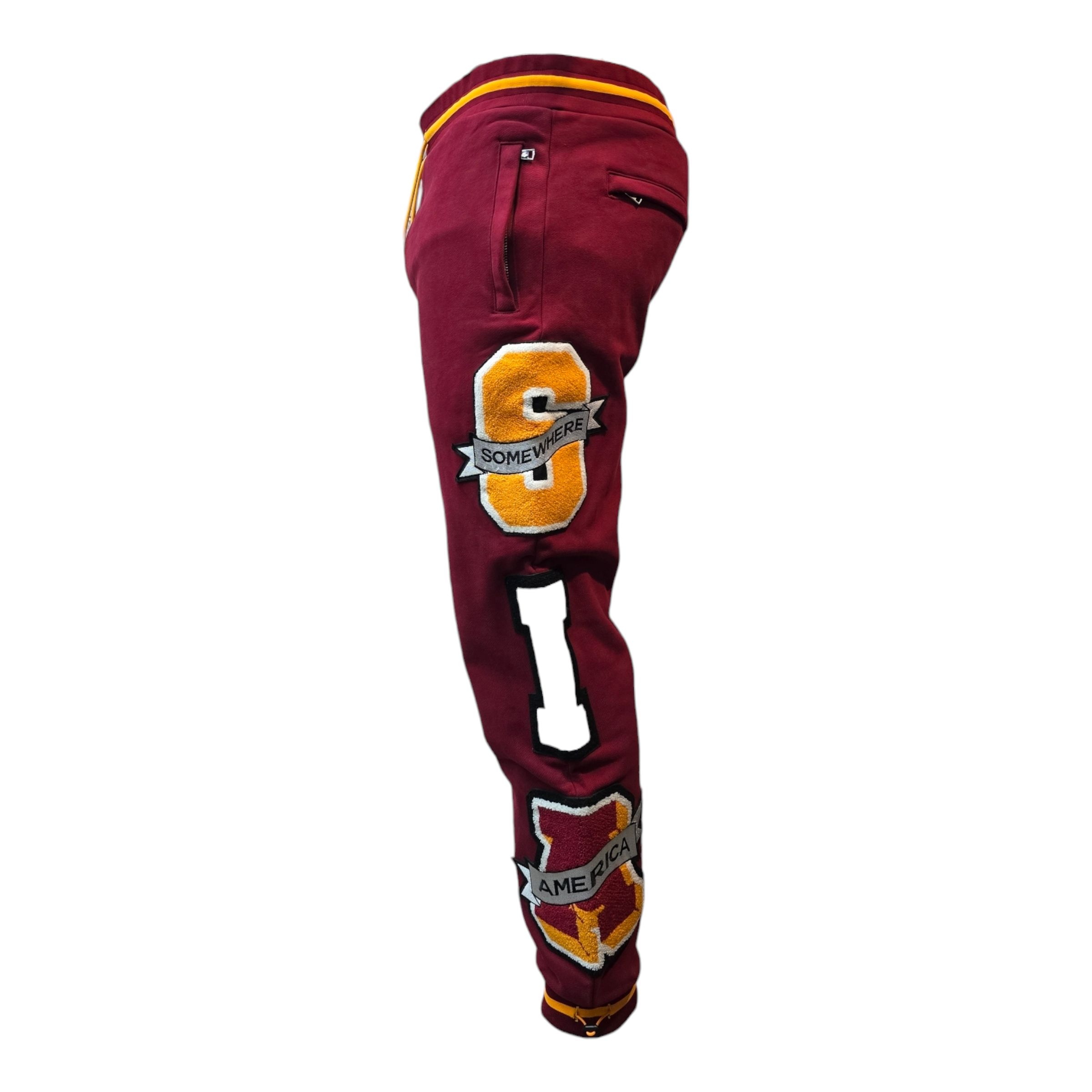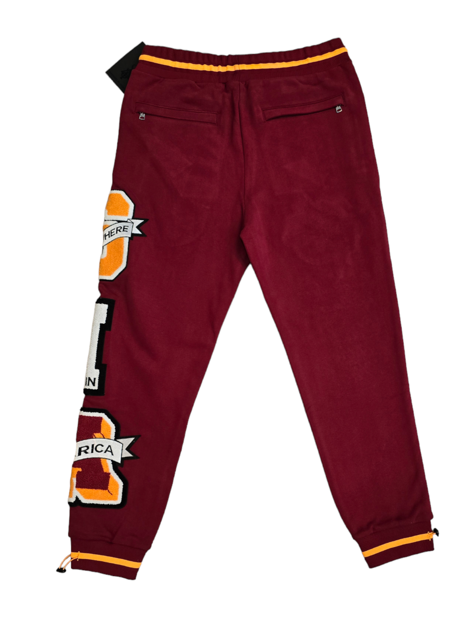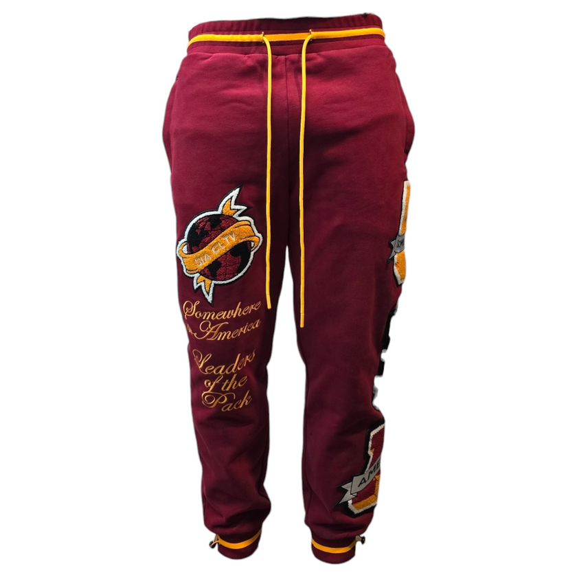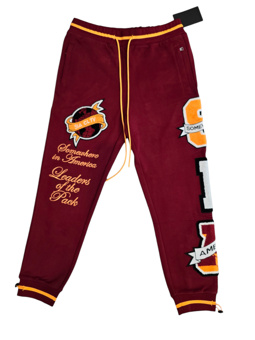 Embrace bold style and unmatched comfort with the SIA "Leaders" Sweatpants. In a striking burgundy hue, these sweatpants feature vibrant yellow and orange varsity-inspired patches and embroidery, including the empowering "Somewhere in America, Leaders of the Pack" motif.