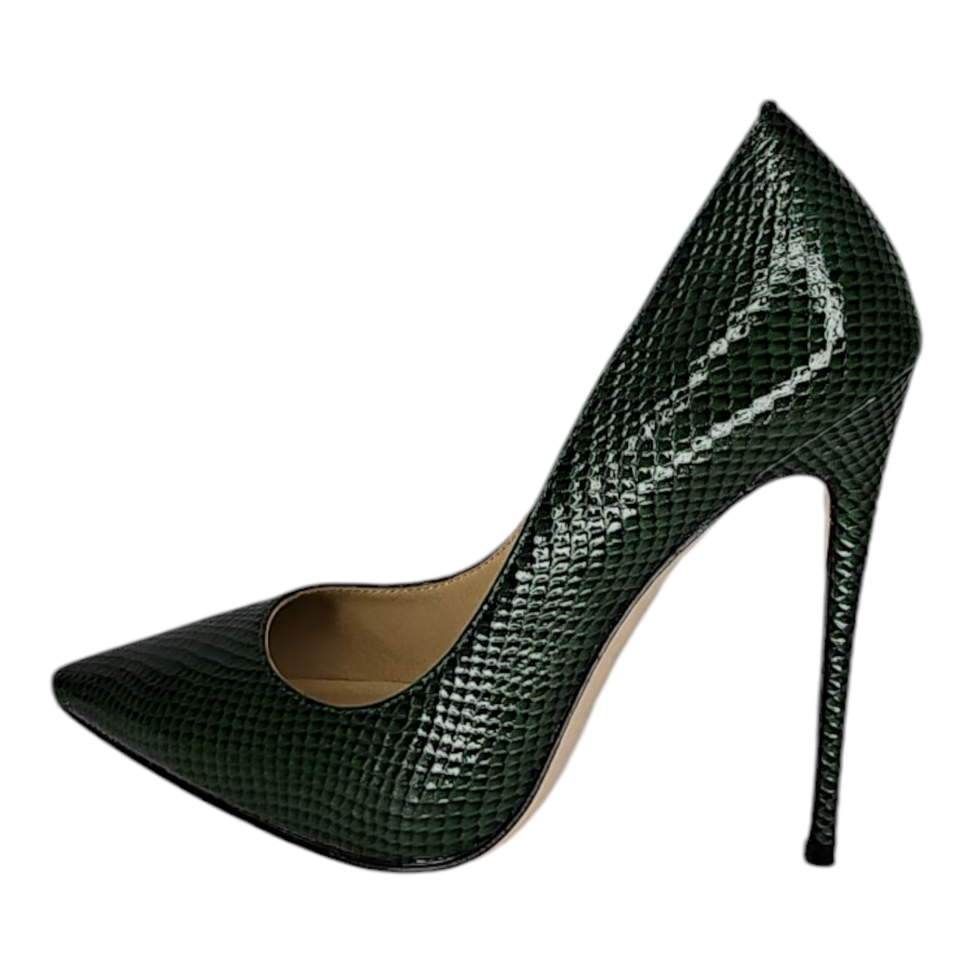 The SIA HER Comfort Envy Pumps (Emerald) are designed to deliver impact without excess—crafted in a rich emerald snakeskin texture that brings depth, dimension, and understated luxury to a classic silhouette. The high-gloss finish catches light subtly, making every step feel intentional.