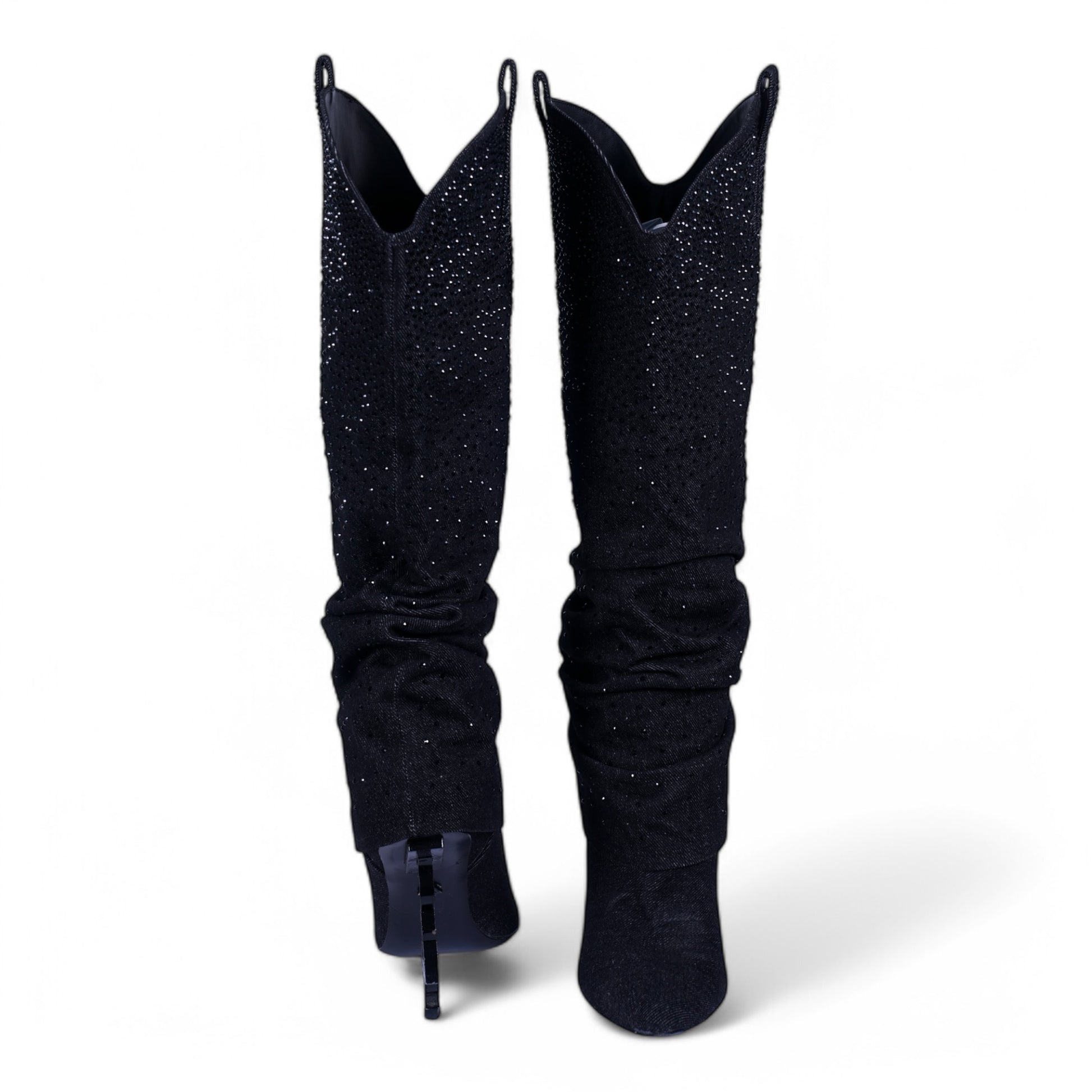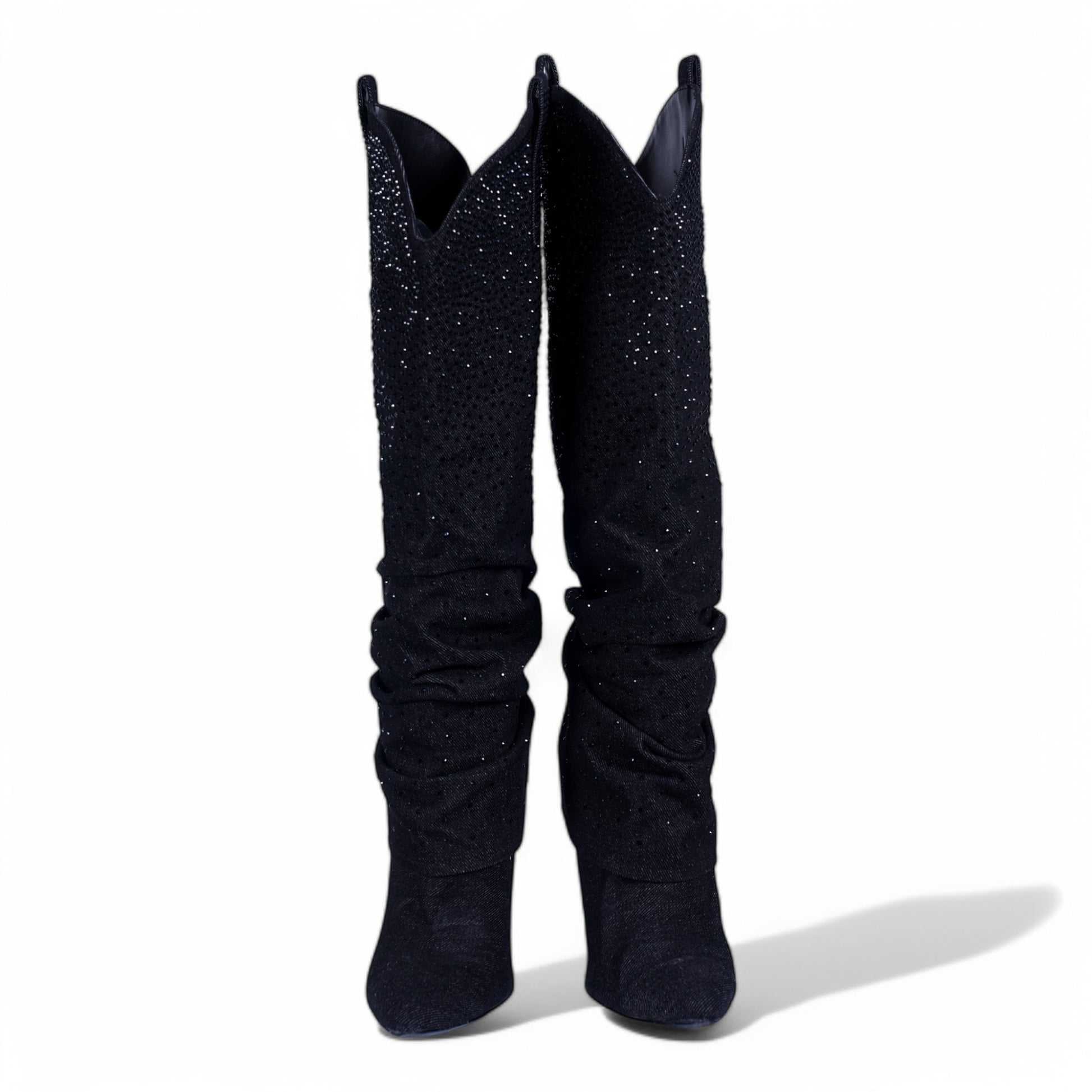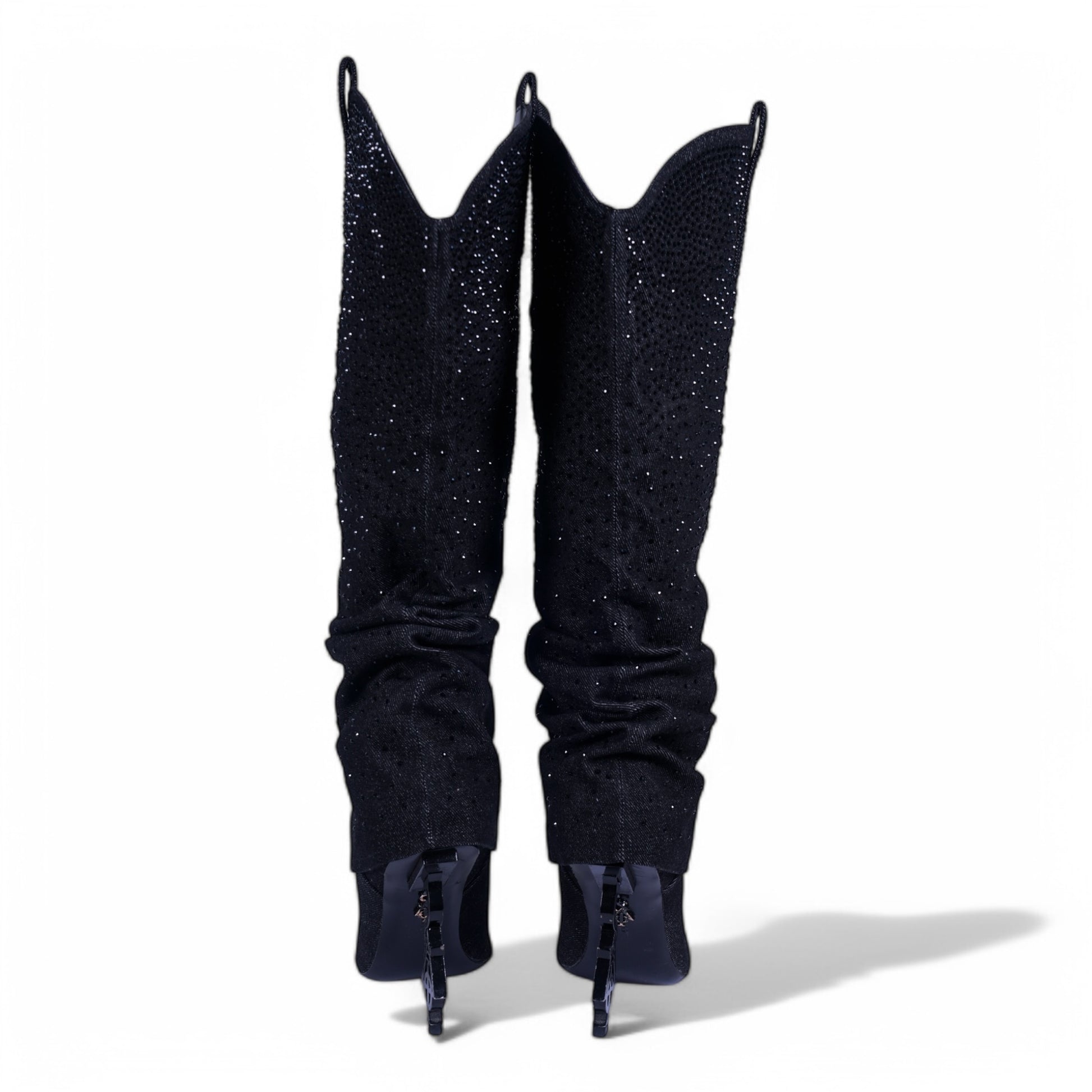 Elevate your style with these stunning Denim Rhinestone Cowboy Boots by SIA HER. Designed for the modern trendsetter, these boots seamlessly combine edgy glamour and Western-inspired charm.
