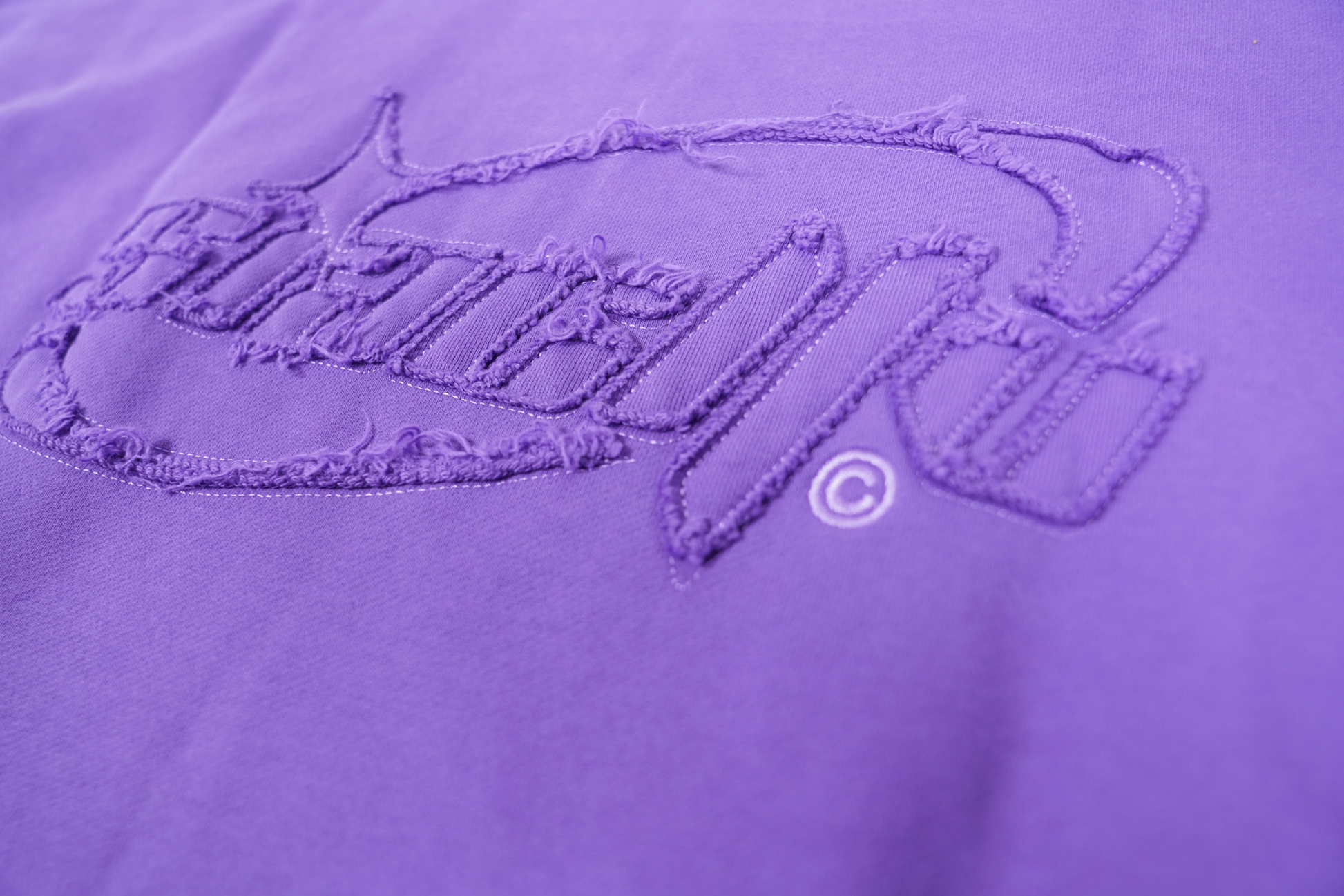 Crafted from heavyweight fleece with a deep washed purple finish, the hoodie features carefully placed distressing throughout the body, sleeves, hood, and pocket, giving each piece a unique, naturally aged character. The fabric feels soft yet substantial, balancing comfort with durability.