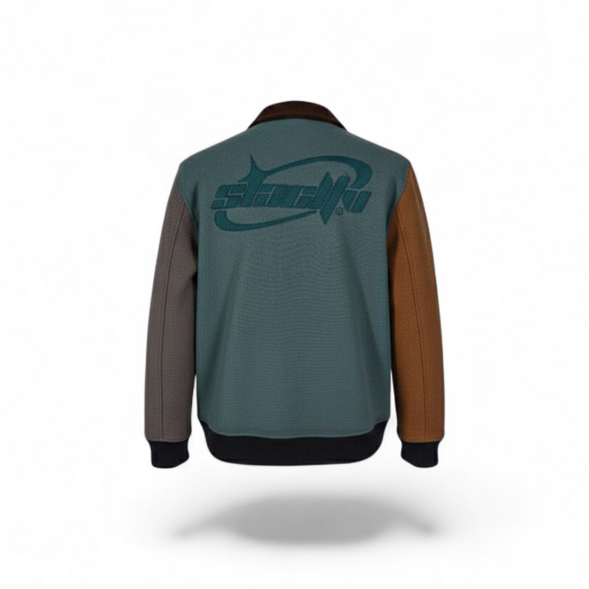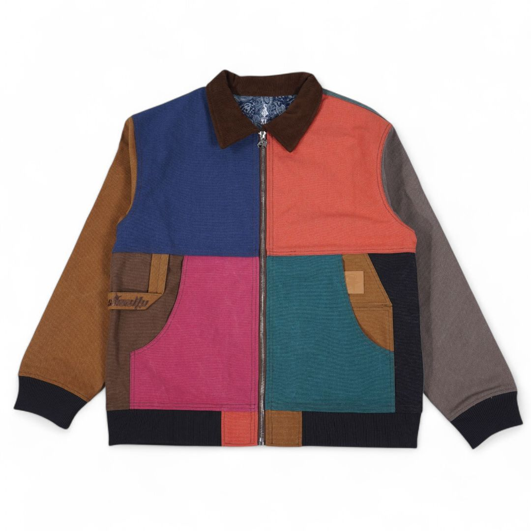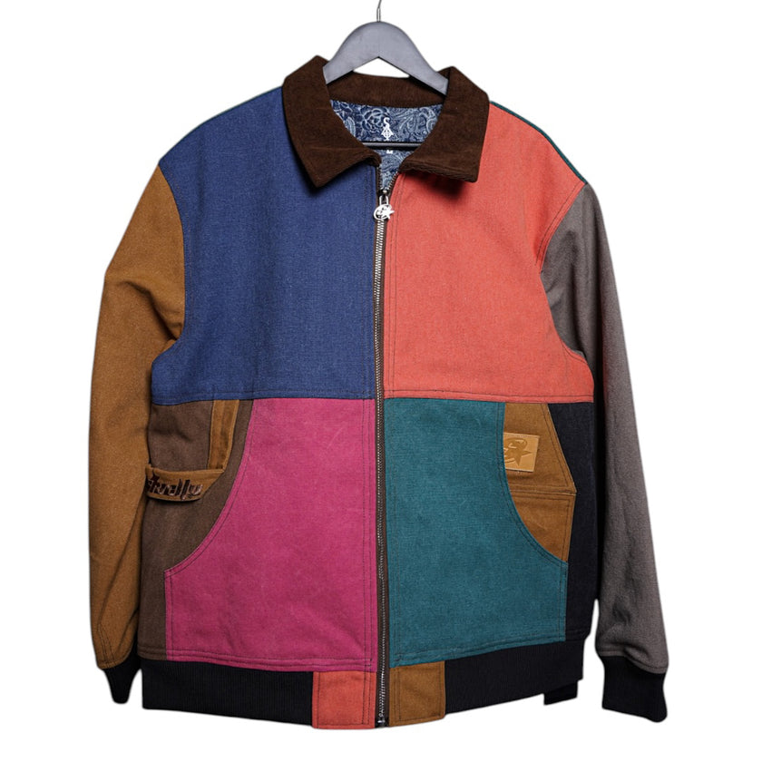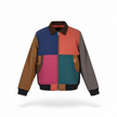 Upgrade your wardrobe with this unique patchwork bomber jacket, a true statement piece that blends vintage aesthetics with modern streetwear appeal. This unisex jacket features a bold color block design, combining shades of blue, red, pink, green, brown, and gray in an eye-catching patchwork pattern.