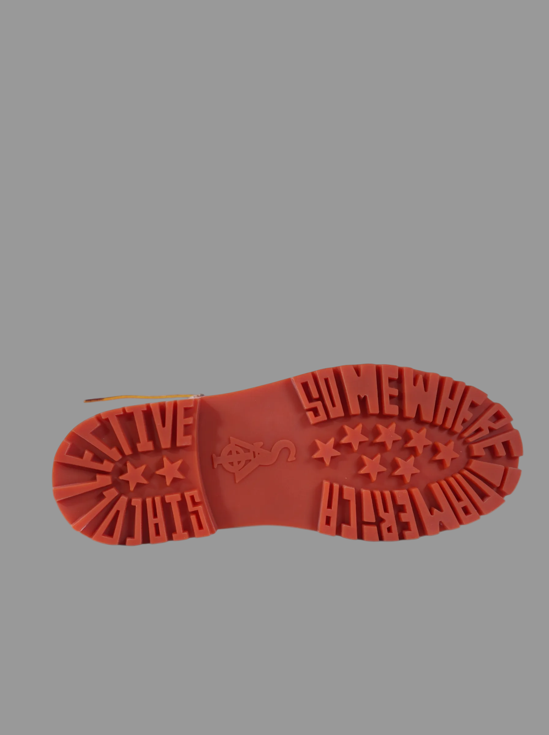 Gold-tone hardware and rope laces reinforce the boot’s workwear foundation, while the padded collar and structured lace-up construction ensure comfort, support, and durability. A lugged rubber outsole, embossed with signature messaging, provides traction and stability with every step.