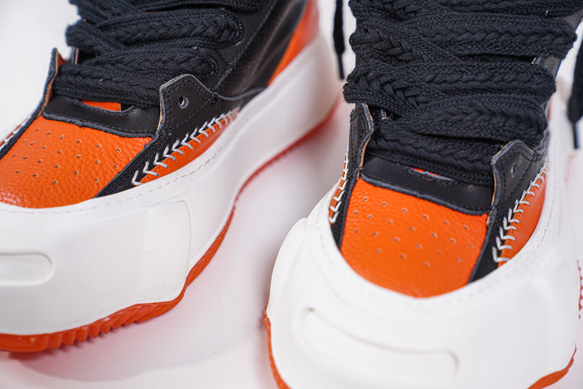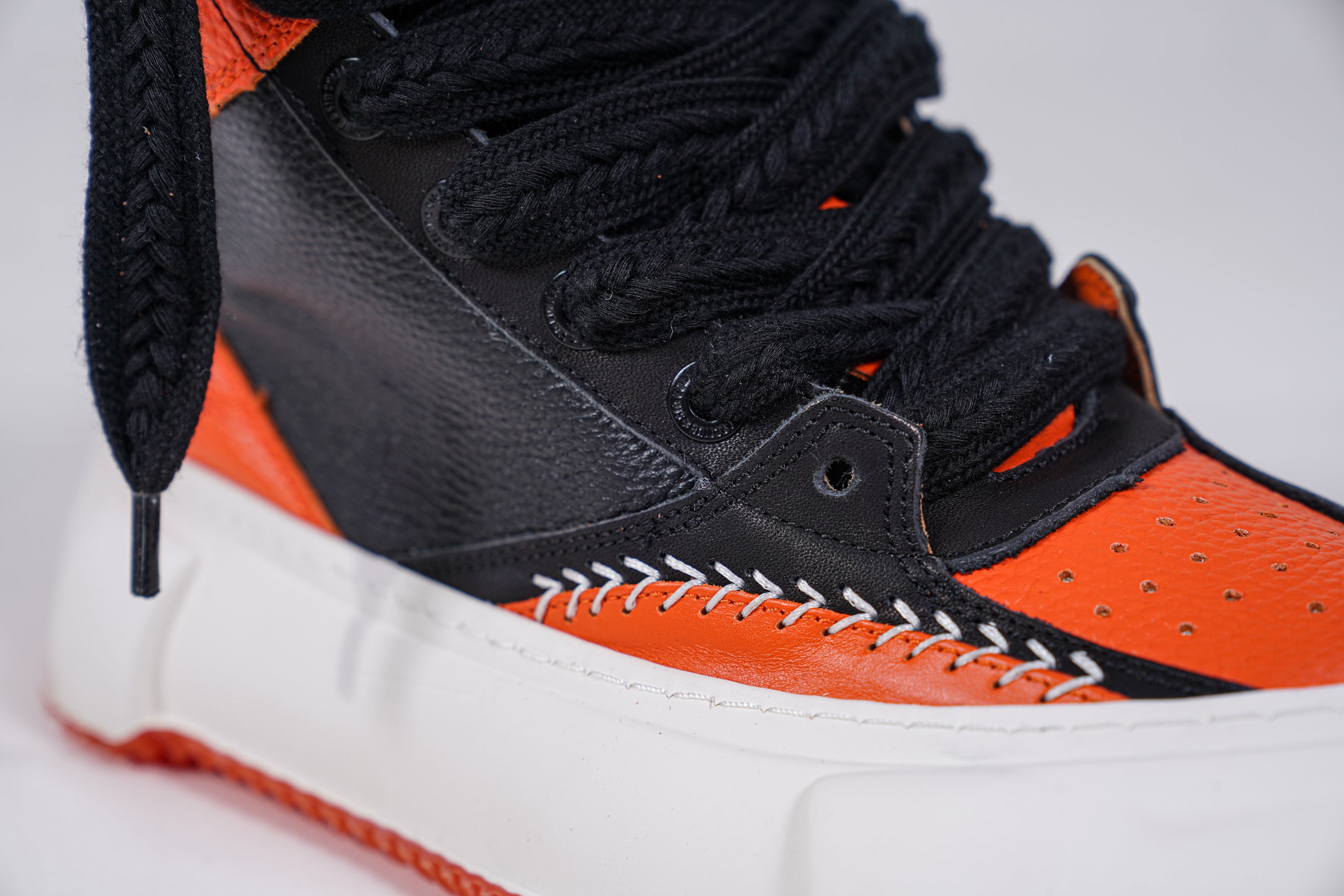 Design Features: Bright orange leather overlays wrapped around a black pony hair mid-panel; clean white stitching detail for an added touch of craftsmanship