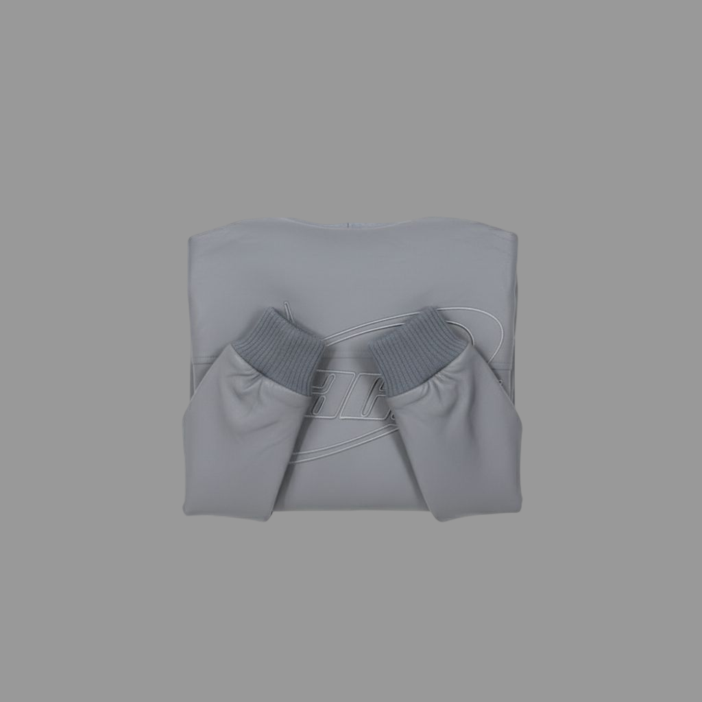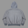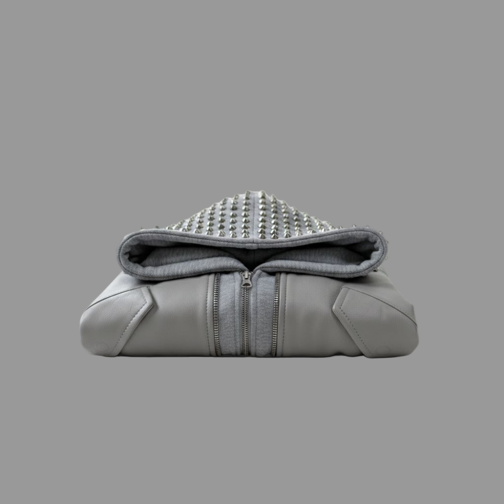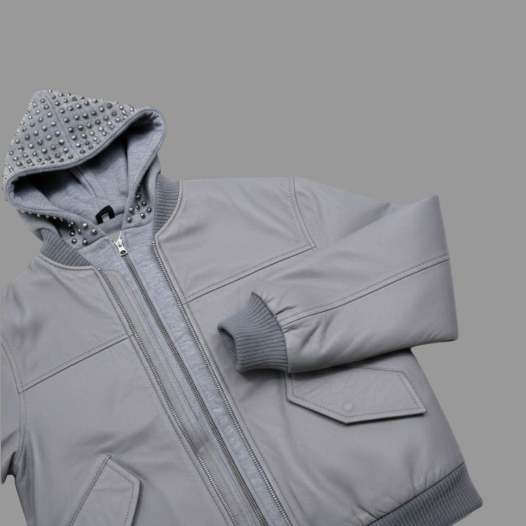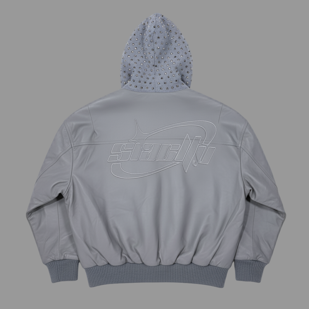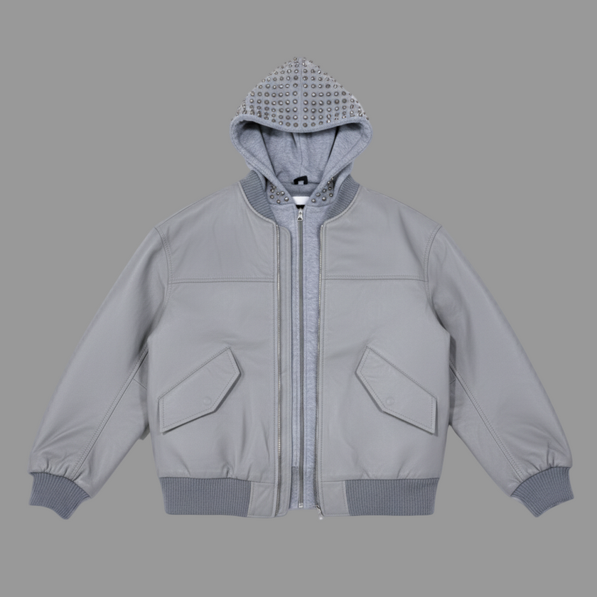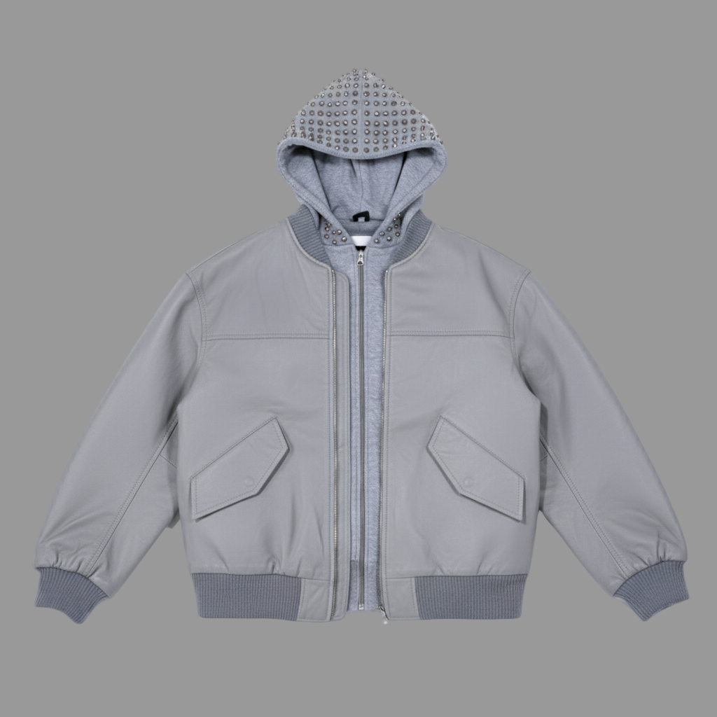 "GREY" LEATHER STUDDED HOOD BOMBER JACKET