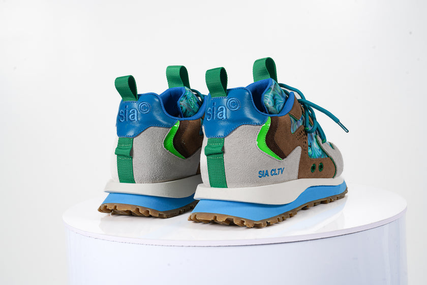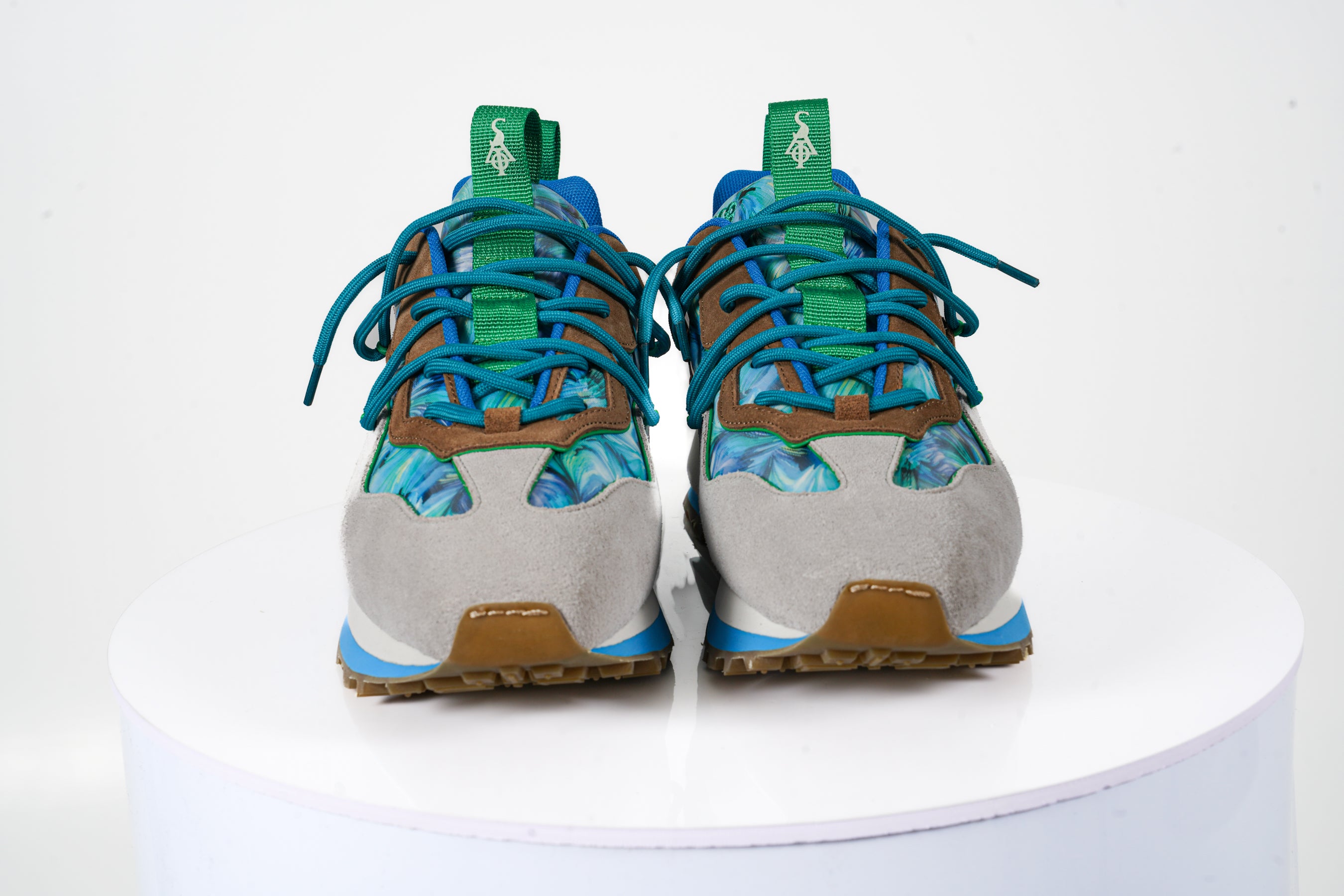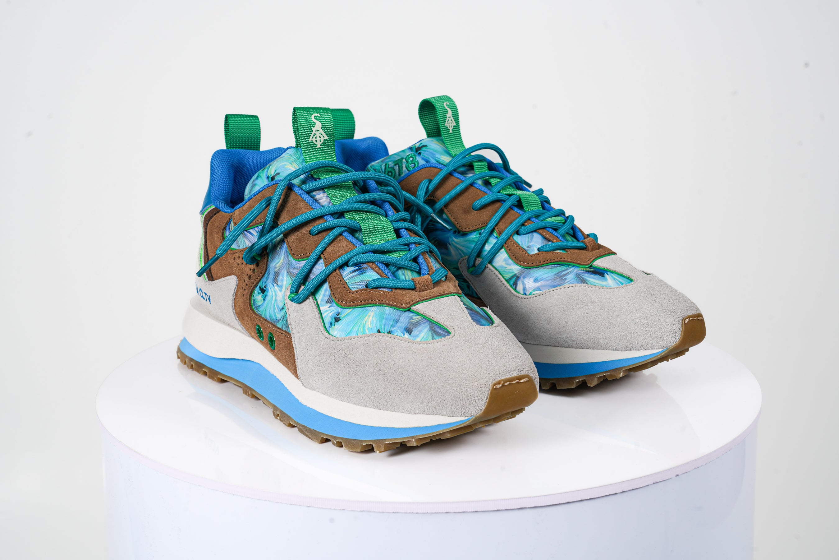 - Upper Material: The shoes are constructed with a mix of premium materials, including suede and textile elements. The suede overlays in beige and brown add durability and elegance, while the textile panels showcase an eye-catching blue and green marble-like pattern for a bold look.