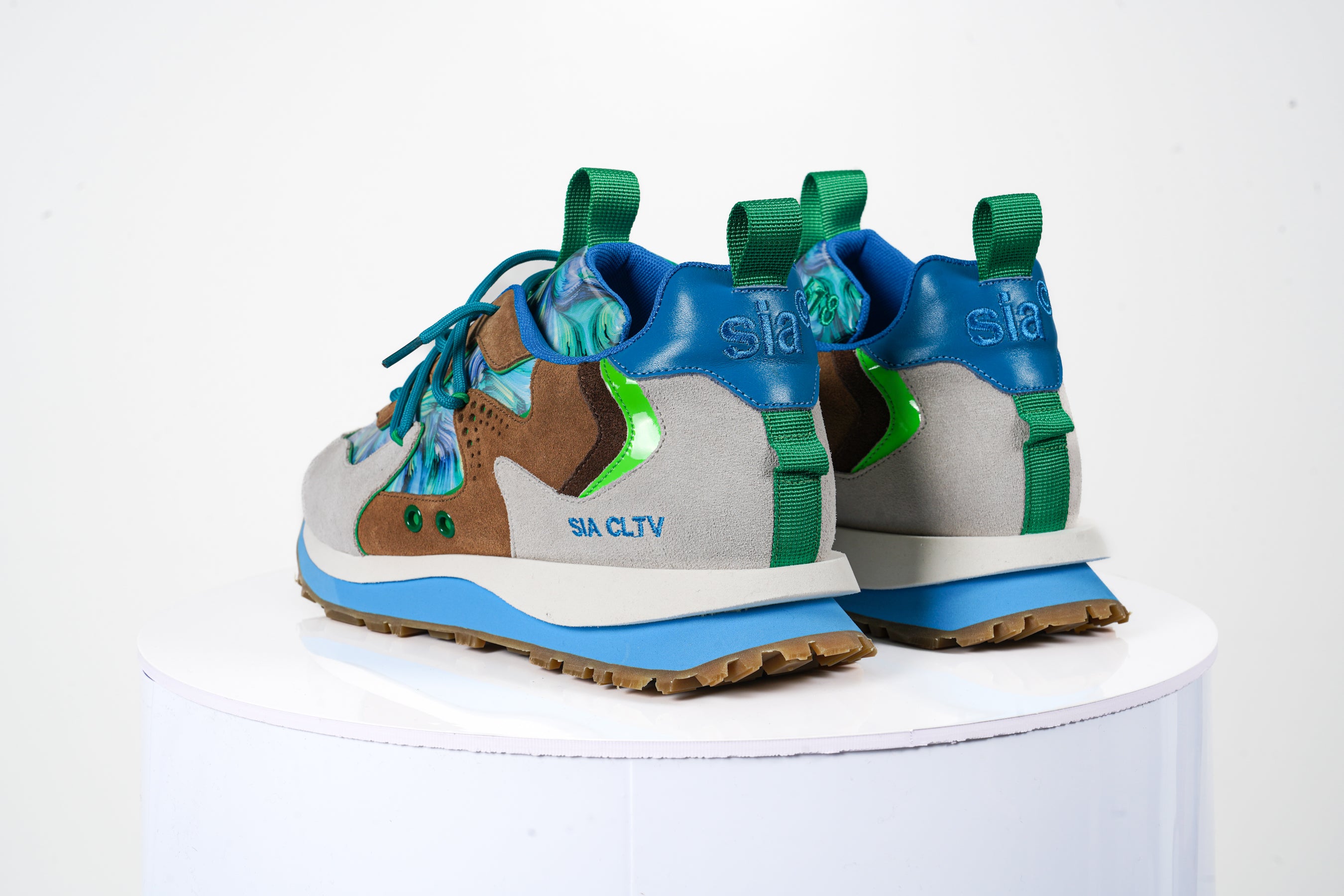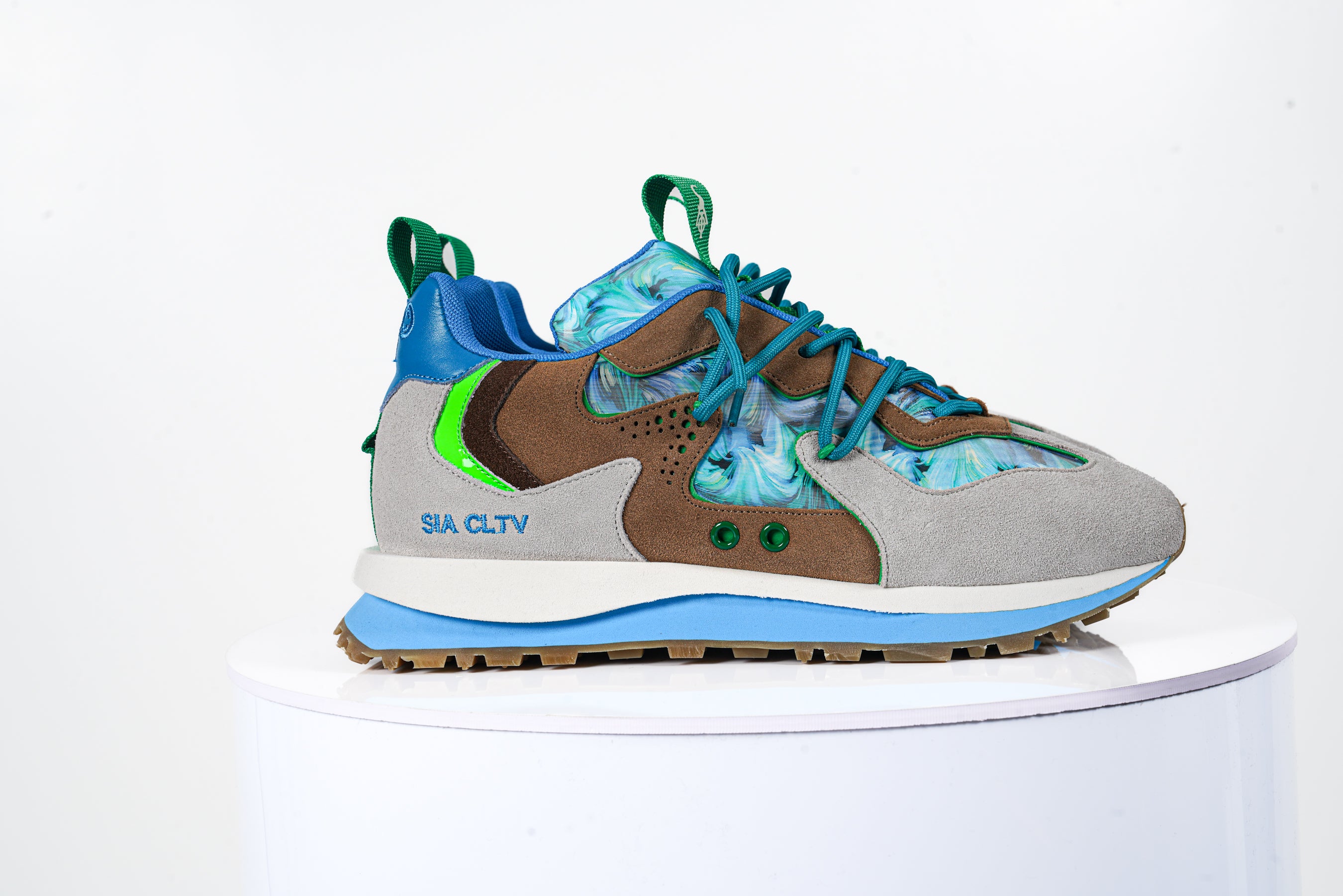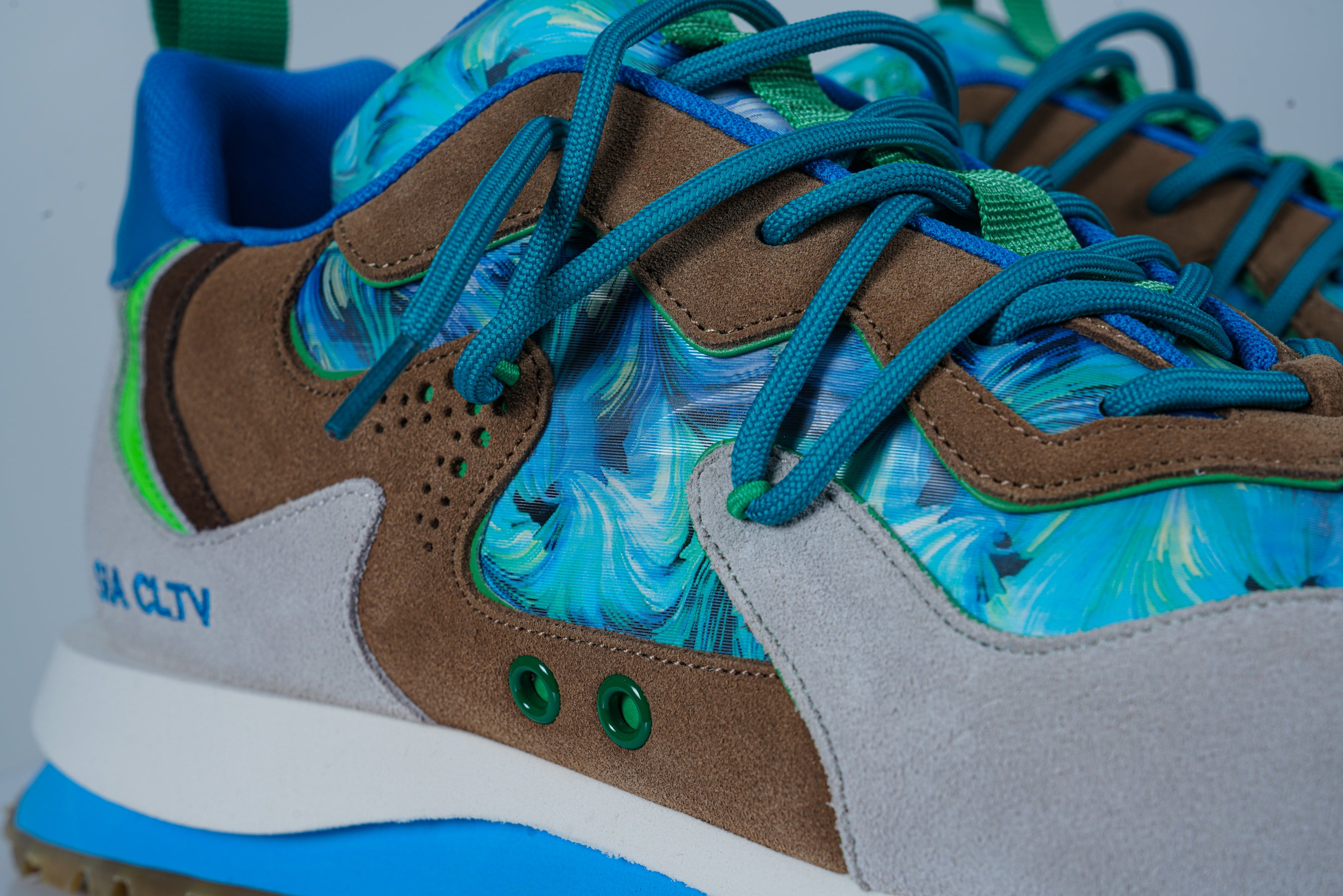 - Upper Material: The shoes are constructed with a mix of premium materials, including suede and textile elements. The suede overlays in beige and brown add durability and elegance, while the textile panels showcase an eye-catching blue and green marble-like pattern for a bold look.
